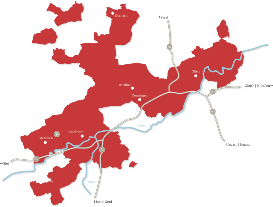Im Herzen der Schweiz gelegen, bietet der Kanton Solothurn eine schnelle Erreichbarkeit aus den Wirtschaftszentren der Schweiz und darüber hinaus.